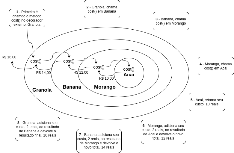 Para calcular o custo do cliente, é preciso chamar o método cost() no decorador externo, Granola, e Granola vai delegar o cálculo do custo para o objeto que decora. Depois que obtiver um custo, ela irá adicionar o seu custo e devolver o valor final que o cliente deve pagar. A imagem abaixo explica as etapas com mais detalhes: